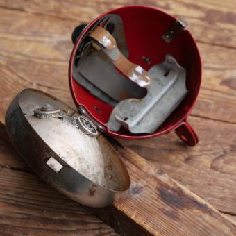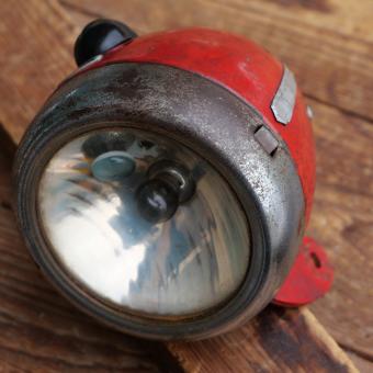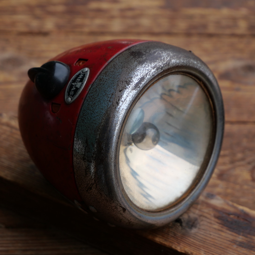 Scheinwerfer "Melas", für Fahrrad, orig. 30er J., Durchmesser ca. 10cm, originale rote Lackierung, mit Chromring, Standlicht über einzulegende 4,5 Volt Flachbatterie, gebraucht mit schöner Patina, Zustand gemäß Bildern