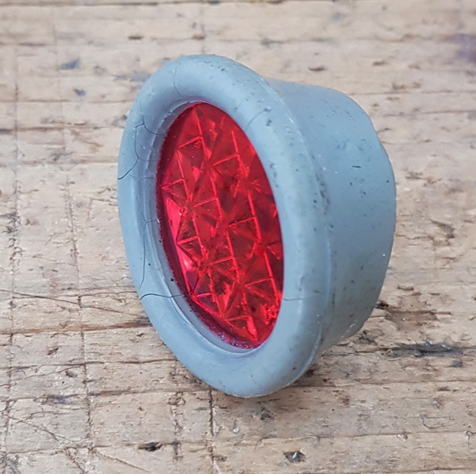 Rückstrahler mit Echtglas Einsatz, orig. Altbestand 40er J., Korpus Hartgummi in fliegergrau, rare, alte Neuware ! Der Hartgummikorpus hat alterungsbedingt partiell die üblichen Haarrisse, die Stabilität ist aber nicht beeinträchtigt.