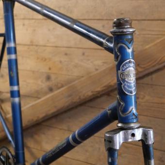 Fahrradrahmen RÖHN für Sportrad, Herren, 26 Zoll, Stahl, 50er J., blau/silber, Linien weiß, Rahmenhöhe 55 cm, Einbaumaß 109 mm, Thompson-Lager Kettenblatt 46 Zähne, Rahmen-Nr. 124XXX, gebraucht mit schöner Patina, Zustand gemäß Fotos