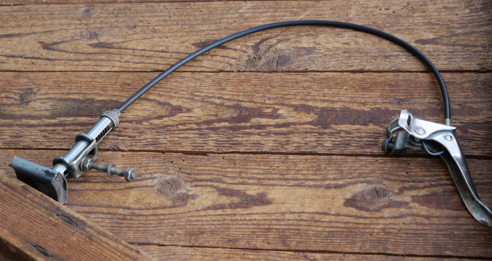 Stempelbremse REICH mit Seilzug u. Hebel, orig. 50er J., verchromt, Bremsfuß ca. 46 x 33mm, Bremshülle ca.