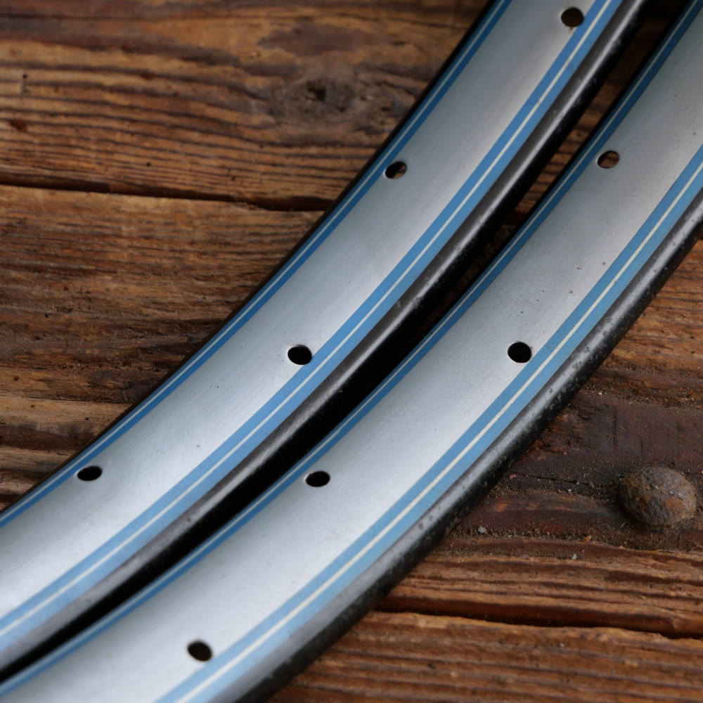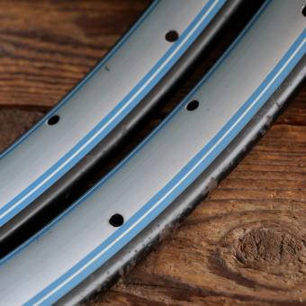 Wulstfelgensatz 26 Zoll (ca. 575), 20er/30er J., Mitte silber, Rand schwarz, Linien blau/weiß, Breite ca. 34 mm, 36 Loch, alte Neuware mit schöner Patina, Zustand gemäß Fotos
