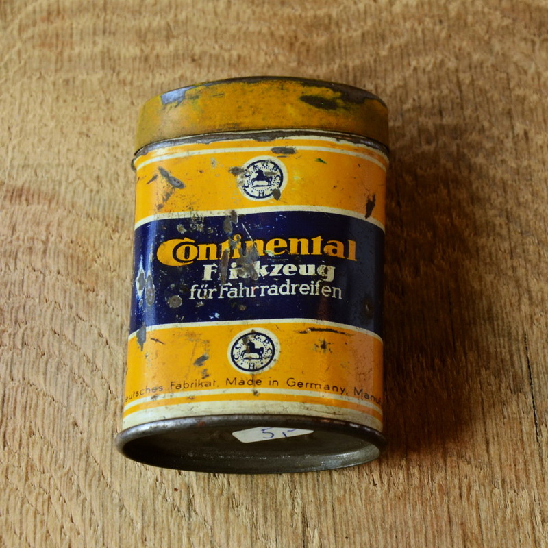 Flickzeug Blechdose "CONTINENTAL" orig. 30er Jahre, 71 x 48 x 23 mm, ohne Inhalt Zur authentischen Füllung haben wir noch altes Flickmaterial zum zuschneiden und orig. alte Continental Gummilösung im SHOP. Zum Gebrauch auch frische Ware in unseren TI