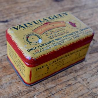 Flickzeug Blechdose "VÁLVULA GUDY" orig. 50er Jahre, 100 x 61 x 50 mm, für Motorräder, ohne Inhalt