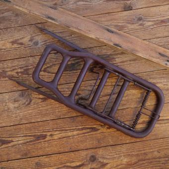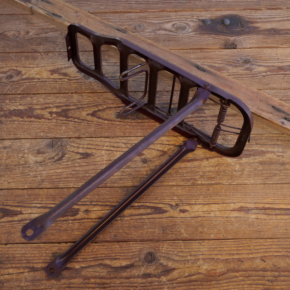 Gepäckträger, orig. 30er-50er Jahre, weinrot, Profilblech, Montage oben an den Sattelstreben, Montage unten auf der Achse, Ladefläche ca. 33 x 17 cm, Strebenlänge ca. 37 cm für 26 Zoll, alte Neuware mit schöner Patina, Zustand gemäß Fotos