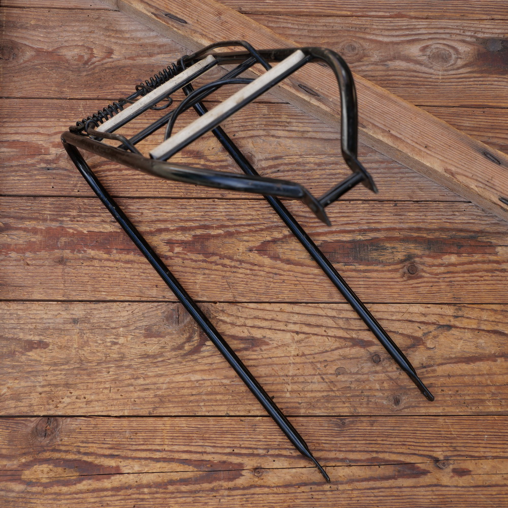 Gepäckträger, orig. 50er/60er Jahre, mit leichten Gebrauchsspuren gemäß Bildern, u. A. für Miele und NSU, Klauenmontage oben am Mittelsteg, Klauenbreite 31mm, untere Montage am Rahmen/Anlötauge, 37 x 14cm, Höhe (gemessen in Montagestellung von Unterkante Ladefläche, grade runter bis Befestigungsbohrung unten) ca. 33cm, schwarz, mit Gummiauflagen