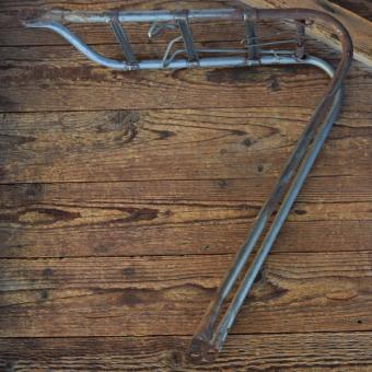 Gepäckträger, orig. 50er Jahre, gebraucht mit Gebrauchsspuren gemäß Bildern, obere Montage am Sattelklemmbolzen, untere Montage auf der Achse, Breite 16,5cm, Höhe (gemessen in Montagestellung von Unterkante Ladefläche, grade runter bis Befestigungsbohrung unten) c.a. 39,5cm