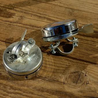 Fahrrad Glocke / Klingel, klassische Glocke , verchromt mit Metalldrücker, Händlermotiv Aufkleber (leicht entfernbar)