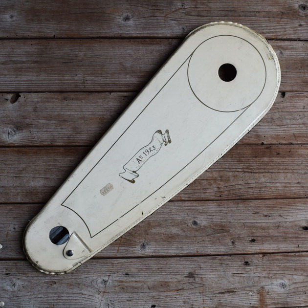 Kettenschutz Kettenkasten Hollandrad, 26 Zoll, Moleskin Lacktuch, weiß (vergilbt), Länge über alles c.a. 59 cm, Lochabstand Mitte - Mitte Achslöcher c.a. 42,5 cm, original alte Neuware