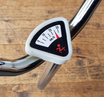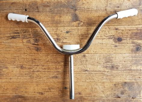 Lenker, Kinderrad 50-70er J. ,NOS, mit Tachoblende, verchromt (leichte Patina) , 22 mm, Breite 53 cm, Gesamthöhe incl. Schaft. . ca. 38 cm. Passend für Kinderräder/Roller mit Außenklemmung zur Lenkerbefestigung, keine Innenklemme!
