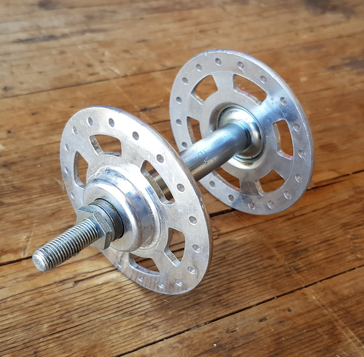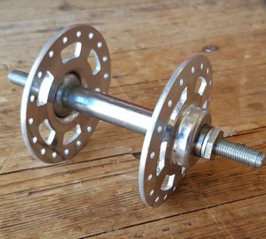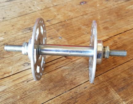 e Vorderrad, "NEW STAR", Frankreich 60/70er Jahre, Aluminiumflansche / Hülse Stahl verchromt, 36Loch, Einbaumaß 97mm, Achse FG 7,9 mm Standard, NOS. Verbaut ab Werk an vielen französischen, englischen und deutschen Rennrädern und Randonneuren.