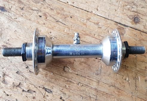 Nabe Vorderrad, mit Öler, DUREX (Bielefelder Traditionshersteller der 30-50er Jahre) , verchromt, 36Loch, Einbaumaß ca. 92 mm (anpassbar mit U-Scheiben etc. im 90-100 mm Bereich) , Achse FG7.9mm incl. Scheiben und Muttern,