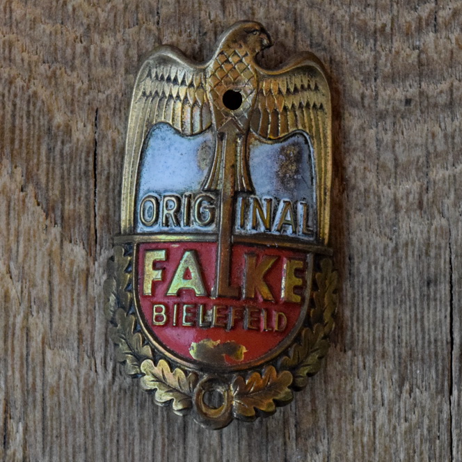 Steuerkopfschild FALKE, 50er Jahre, Originalschild aus Sammlungsbestand, Lochabstand 43 mm
