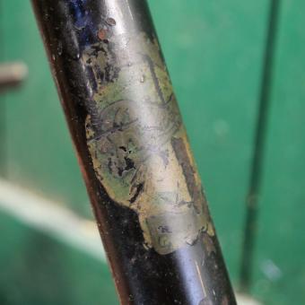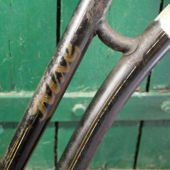 Fahrrad - Damenrahmen Schwanenhalsform "Rixe" 28 Zoll, 1940er J., schwarzer Originallack mit goldenen und weißen Zierlinien, Rahmenhöhe 55cm, Rahmennummer 339XXX, Innenlagermaße 70/40, Steuerkopfmaße 180/30, ohne Steuerkopfschild, deutliche Patina, Zust