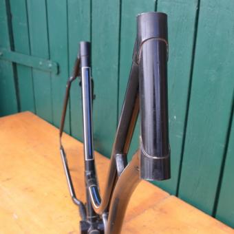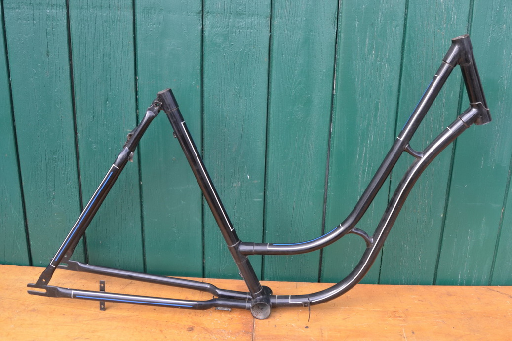Dieser Rahmen wurde von Jahrzehnten abgestrahlt, neu lackiert, handliniert aber nie aufgebaut. Ein paar lagerungsbedingte, kleine Kratzer können vorhanden sein. Ansonsten aber eine unschlagbar günstige Möglichkeit, einen bereits aufgearbeiteten, frühen Rahmen zu neuem Leben zu erwecken!