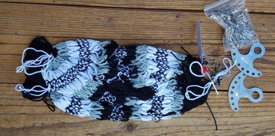 Rocknetz gem. Foto (das Bild zeigt das montierte Netz am Schutzblech) , frühe Quadranten Ausführung, passend für 28" Räder der 00-30er Jahre, grau-schwarz-weiß. Die Netze werden für uns in Deutschland nach alten Mustern aufwändig neu gefertigt, es sin