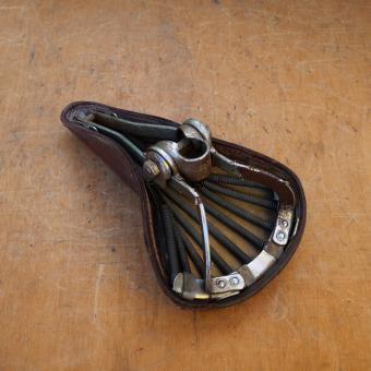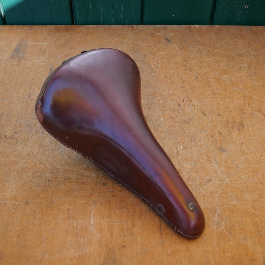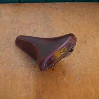 Sattel "Lepper Super Elasco", hochwertiger Ledersattel, mittelbraun, passend für Sporträder der 50er Jhare, Lepper Blechschild defekt, Breite 16 cm, Länge 27 cm