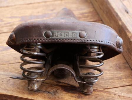 Sattel MIELE, Herren, für Sportrad, 50er Jahre, Leder braun, Gestell verchromt, Breite ca. 16 cm, Länge ca. 27 cm, gebraucht mit schöner Patina, Leder gut, Zustand gemäß Fotos