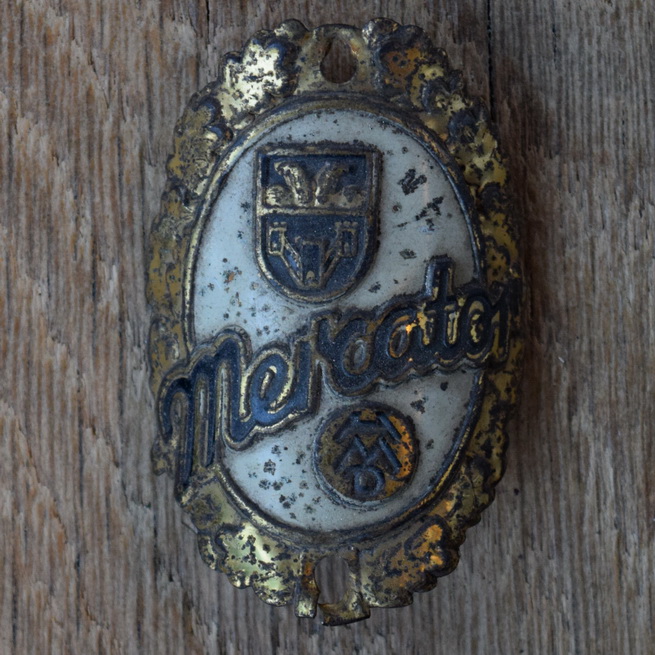 Steuerkopfschild MERCATOR, 50er Jahre, Originalschild aus Sammlungsbestand, unteres Loch eingerissen, Lochabstand 52 mm
