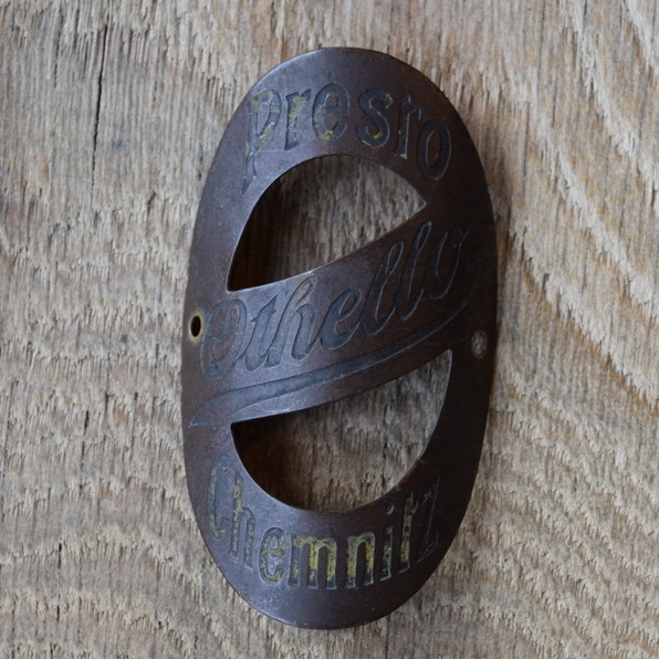 Steuerkopfschild Presto Othello, 20er Jahre, Originalschild aus Sammlungsbestand, Lochabstand 38 mm Ideal für den passenden Fahrradoldtimer oder die Sammlervitrine. Zustand siehe Bild.