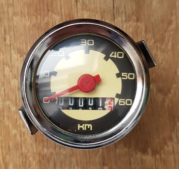Tachometer mit zweifarbigem Zifferblatt, typ. Einbautachometer für 50-70er Jahre Mopeds mit Standard ca. 48 mm Durchmesser.