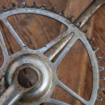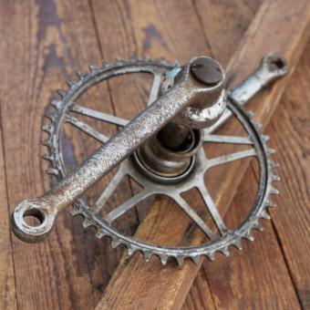 Kettenblatt 46 Zähne, Kurbellänge 175 mm, Durchmesser Lagerschalen 40 mm, gebraucht mit Patina, Zustand siehe Bilder.