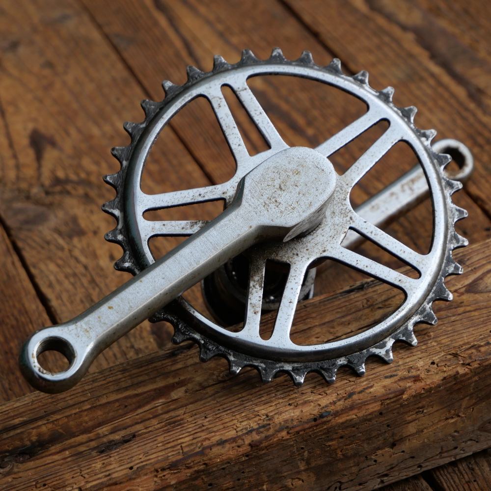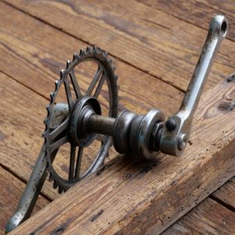 Tretlager universell für Kinderrad, orig. 70er/80er Jahre, verchromt, Thompson-Keillager, Durchmesser Lagerschalen 40 mm, Kettenblatt 36 Zähne, Kurbellänge 120 mm, gebraucht mit Patina, Zustand siehe Bilder.