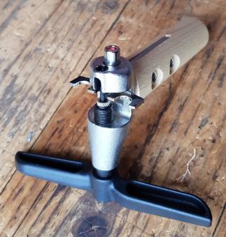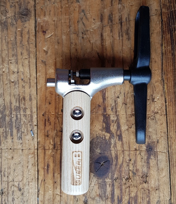 Kettenentnieter, "Super Universal" solide Werkstattausführung mit Holzbeschlag, für alle Standard 1/2 Zoll Fahrradketten geeignet. Die Haltegabel positioniert die Kette korrekt, Beschädigungen werden so vermieden.