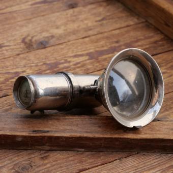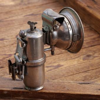 Durchmesser Reflektor 10,5 cm, gebraucht mit Patina, alte Reparatur an Carbid-Behälter,