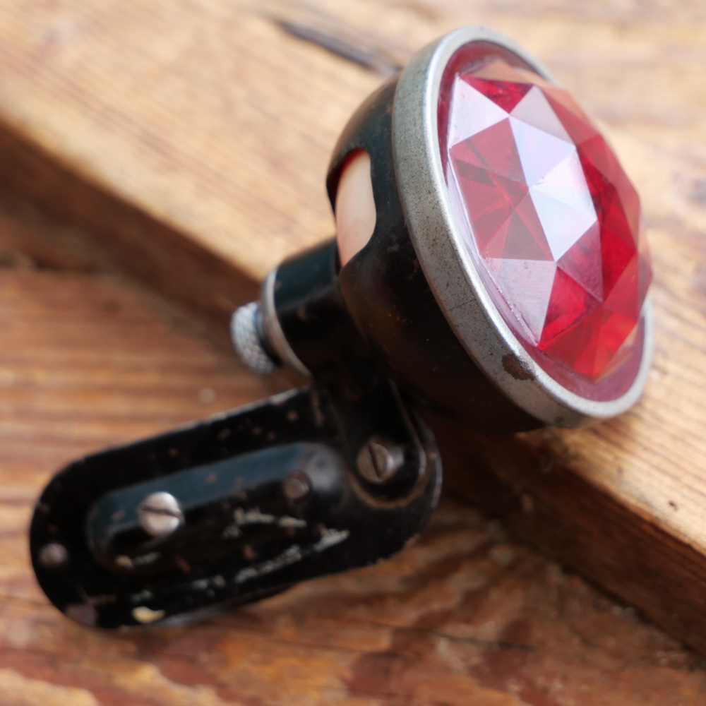 Rücklicht JA-GO, für Strebenmontage, orig. 30er Jahre, Stahl lackiert/verzinkt, Facetten-Echtglas, sehr seltenes Modell, Durchmesser ca. 5cm, alte Neuware mit schöner Patina, Zustand gemäß Fotos