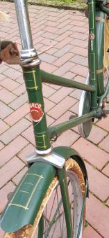 Allgemeiner Wartungshinweis (gilt für alle angebotenen Fahrräder) : Das angebotene Fahrrad stammt aus einer alten Sammlung und die letzte Wartung /Überarbeitung liegt länger zurück ! Wer das Fahrrad nicht zu rein musealen Zwecken nutzt und fahren möchte, sollte VOR der ersten Fahrt sämtliche Schraubverbindungen nachziehen, alle Lager und Schmierstellen neu-oder nachschmieren, die Bereifung prüfen und wenn nötig erneuern, die Beleuchtung prüfen und gesetzeskonforme Zusatzstrahler montieren.