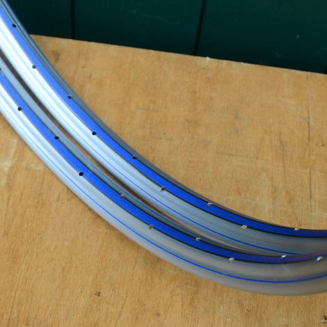 Felgensatz 26 x 1,75, 50er/60er Jahre, silber lackiert, blau-gold liniert, NOS mit leichter Patina.