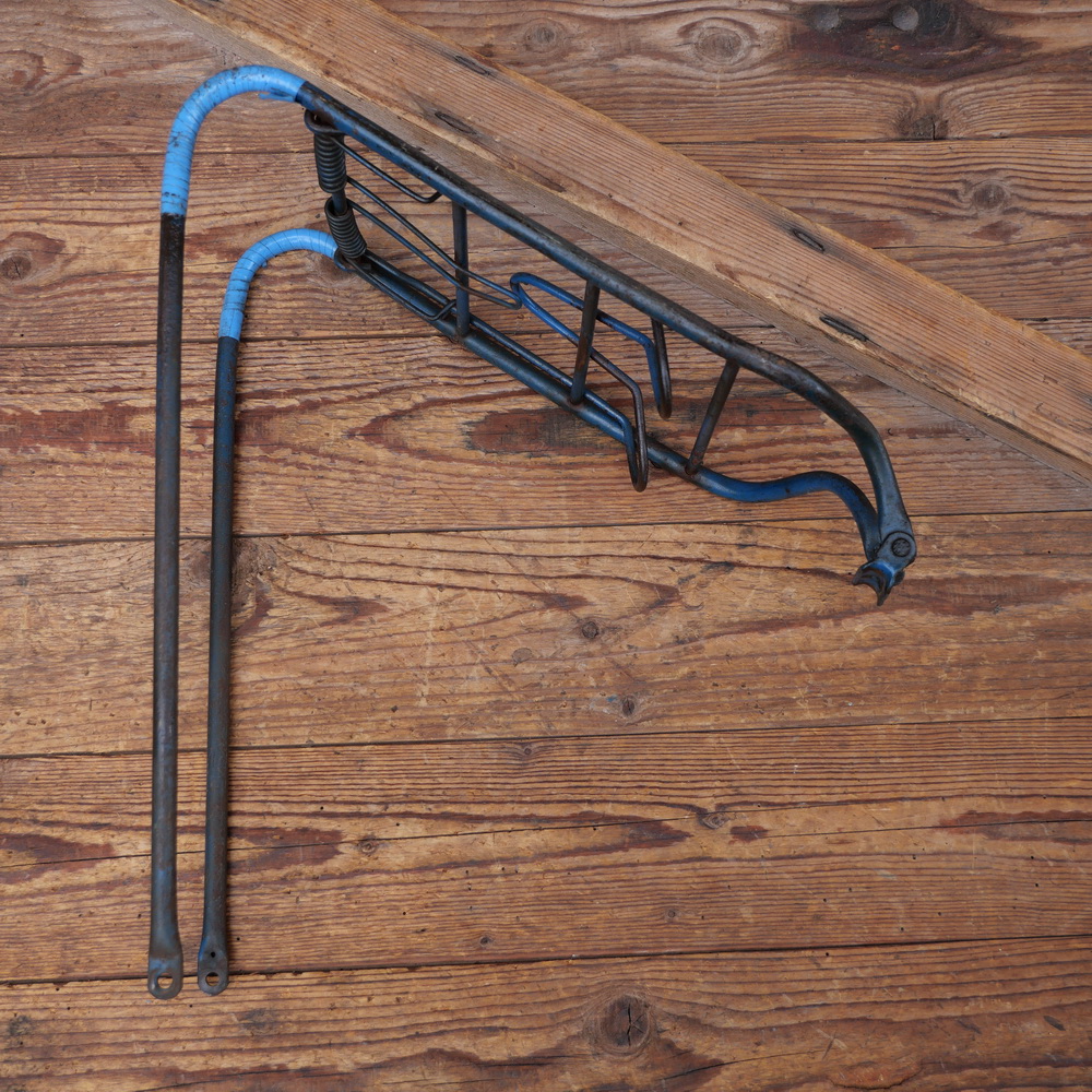 Gepäckträger, orig. 50er/60er Jahre, mit leichten Gebrauchsspuren gemäß Bildern, Montage oben am Mittelsteg mit Senkrechtbohrung, untere Montage am Rahmen/Anlötauge, kurze, breite Ausführung, Ladefläche ca. 24 x 17cm, Höhe (gemessen in Montagestellung von Unterkante Ladefläche, grade runter bis Befestigungsbohrung unten) ca. 32cm, blau, Kratzer, Flugrost