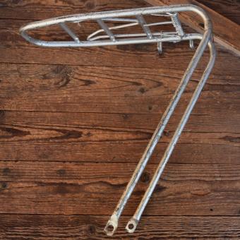 Gepäckträger, orig. 50er Jahre, gebraucht mit Gebrauchsspuren gemäß Bildern, obere Montage mit Klemmbefestigung, untere Montage auf der Achse, Breite 16cm, Höhe (gemessen in Montagestellung von Unterkante Ladefläche, grade runter bis Befestigungsbohrung unten) c.a. 37,5cm