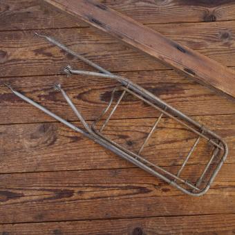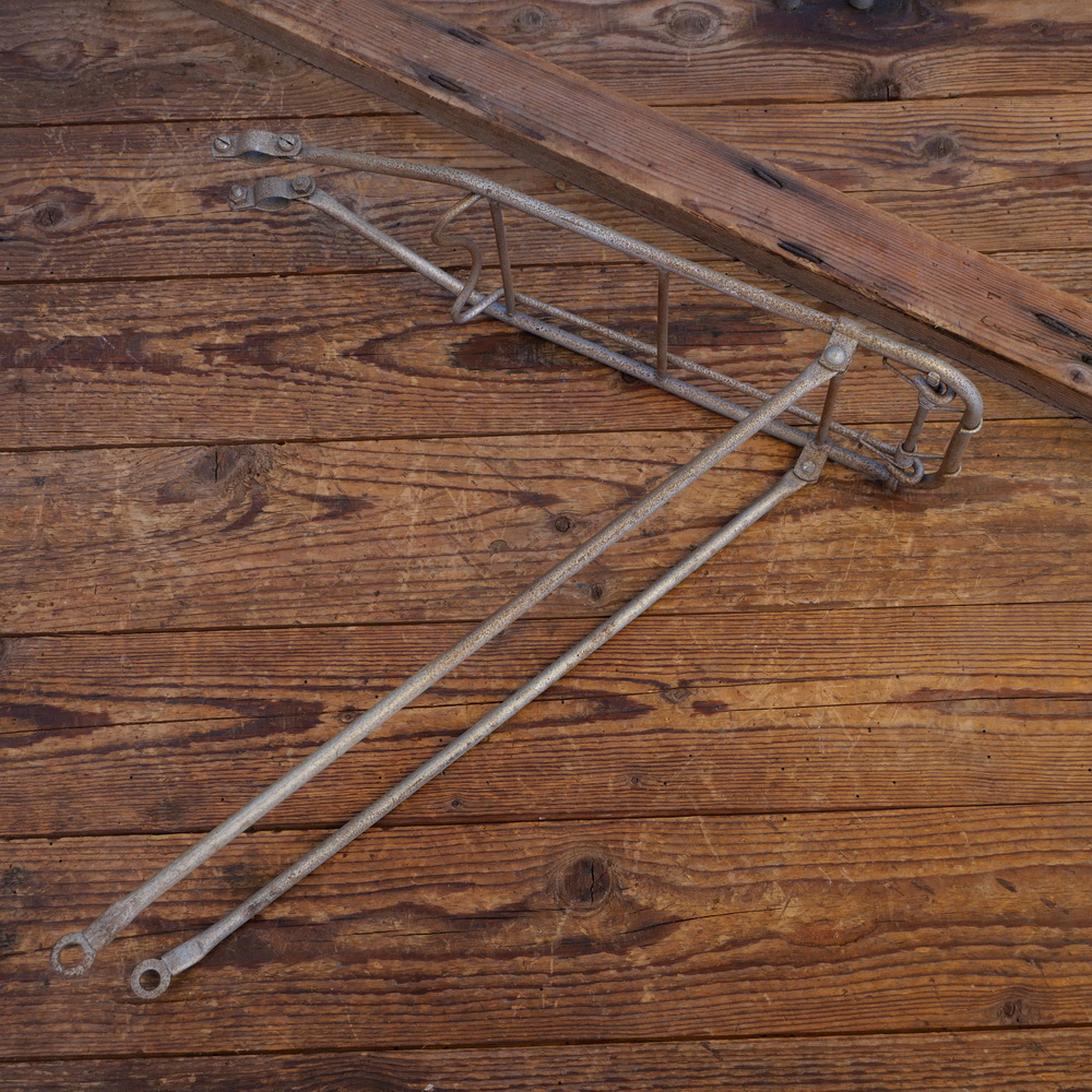 Gepäckträger, orig. 50er Jahre, silber, Montage oben mit Schellen oder Anlötsockeln, Montage unten auf der Achse, Ladefläche ca. 27 x 14 cm, Strebenlänge ca. 41 cm für 26 und 28 Zoll, alte Neuware mit Patina, Zustand gemäß Fotos
