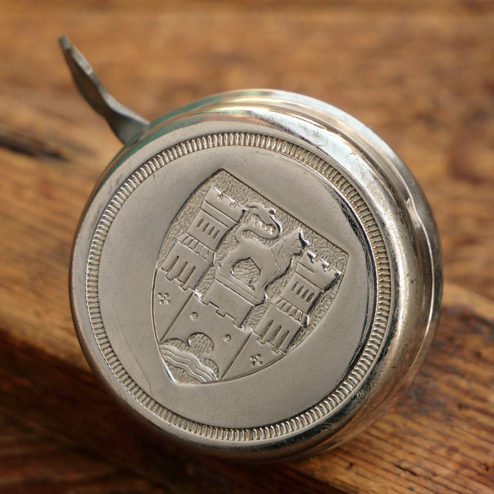 Fahrrad/Moped Klingel, Motiv Wappen Wolfsburg/BÜSSING, orig. 50er/60er Jahre, verchromt, Durchmesser 59 mm, gebraucht, Zustand siehe Bilder. Diese Klingel kommt mit funktionstüchtigem Unterteil.