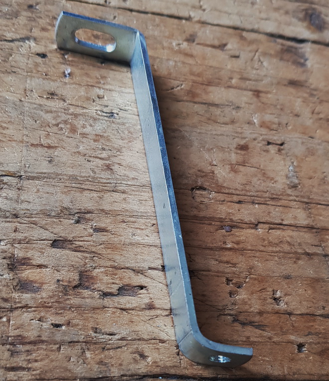 Halteblech für Kettenschutz, Montage unterhalb der Tretlagermuffe, L: ca. 95mm, für ca. 220 mm Durchmesser Ketteschschutz, PAGE (deutsche Produktion, 70-90er Jahre Ausführung) , glanzverzinkt, alte Neuware