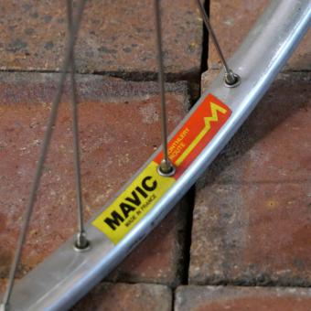 Vorderrad 27 Zoll (630), 80er J., für Rennrad, MAVIC Monthlery Route Schlauchreifenfelge, Alu, silber, Breite 22 mm, Nabe: GALLI MAILLARD, Alu, Einbaumaß: ca. 100 mm, Speichen 2mm Niro, alte Neuware mit minimaler Patina, Zustand gemäß Fotos