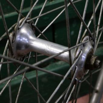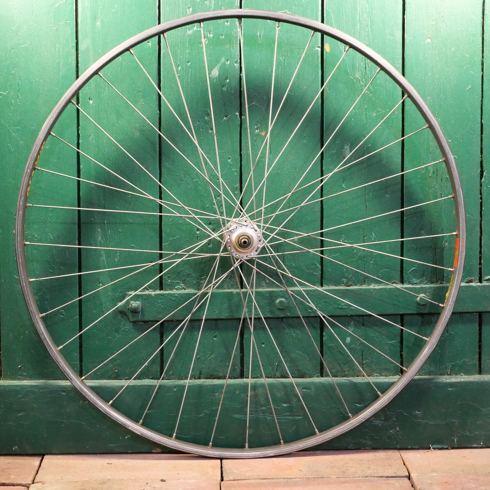 Vorderrad 27 Zoll (630), "Mavic GP4" für Schlauchreifen, 70er/80er Jahre, Hohlkammer, braun eloxiert, Breite ca. 20mm, 36 Loch, 2mm Zinkspeichen 4-fach gegreuzt, Nabe "Pelissier", Einbaumaß ca. 96mm, gebraucht, guter Zustand gemäß Fotos