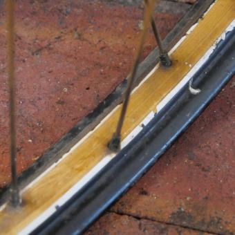 Mitte Holzdekor, Linien weiß, Einbaumaß ca. 95mm, F&S-Nabe verchromt, Speichen 2 mm verchromt, gebraucht mit