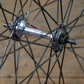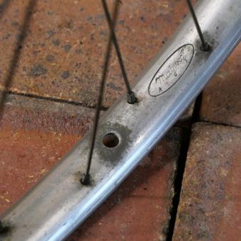 Vorderrad für Wulstbereifung 26 Zoll (571), 30er J., MAYWEG-Felge Alu, Breite 32 mm, F&S-Nabe verchromt, Einbaumaß ca. 91 mm, 2mm Chrom-Speichen, gebraucht mit Patina, Zustand gemäß Fotos