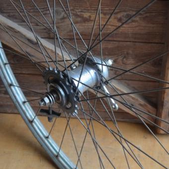 Laufrad 28 x 1,75, silber, grün liniert, Torpedo-Nabe 1954, orig. Altbestand mit Patina