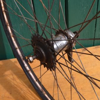 Laufrad hinten 28 x 1,75 schwarz, Linierung weiß/rot, Breite 36 mm, Ventilbohrung 8,5 mm, Einbaumaß 110 mm, Modell von 1953 mit deutlichen Gebrauchsspuren