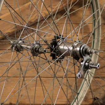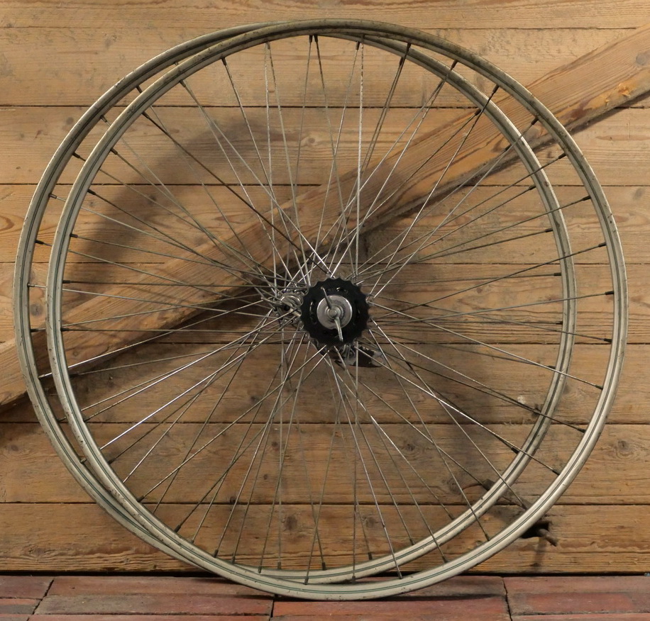 Laufradsatz 28 Zoll (622) für Drahtbereifung, 50er Jahre, Felgenbreite ca. 35 mm, silber, Linierung grün,