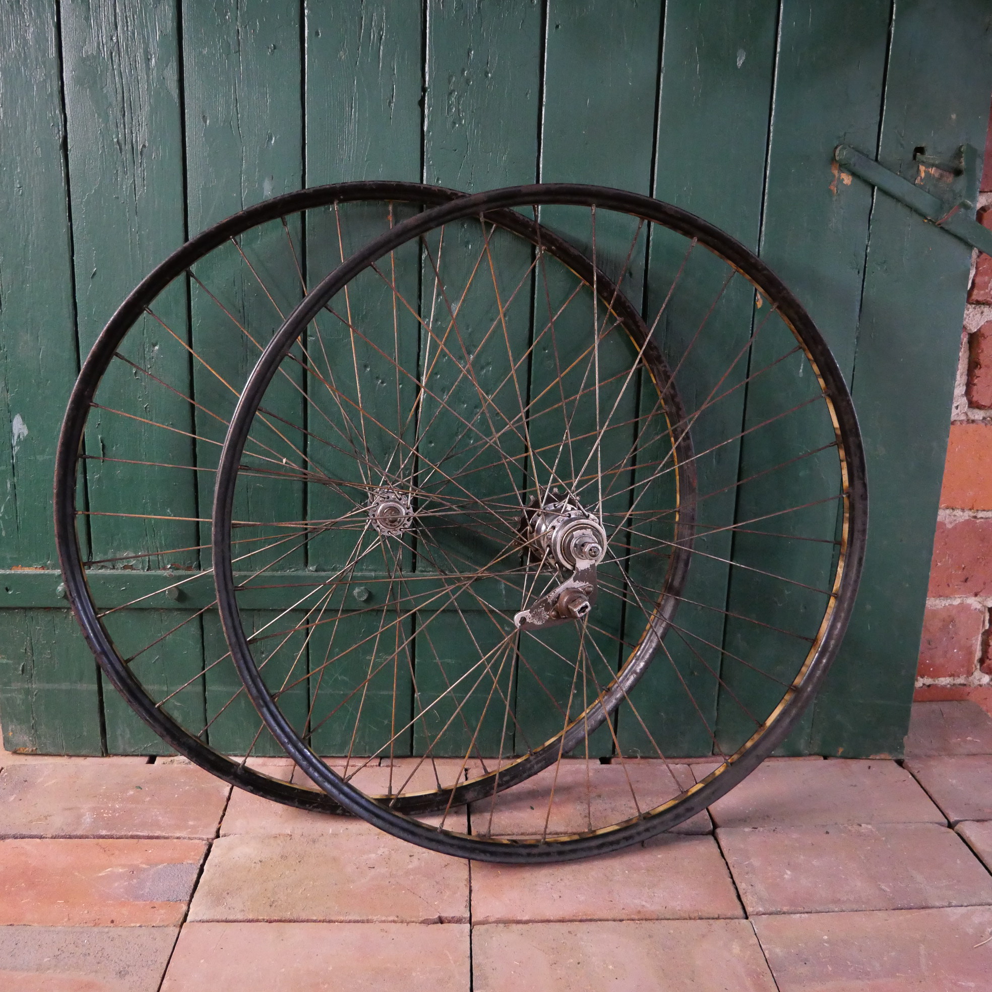 Laufradsatz 28 x 1,75, "Miele" schwarz, 50er Jahre, Linierung gold geflammt, Hinterradnabe "Sachs Torpedo Modell 53", Vorderradnabe "Miele", Speichen verzinkt, Felgenbreite 36 mm, mit Nabenschloß, Einbaumaß 90/110 mm