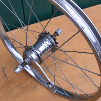 Laufrad hinten 18 Zoll, 18 x 1,75 von "Ruhrwerk", Nabe "Favorit" Ventilbohrung 8,5 mm, Breite 28 mm, Einbaumaß 108 mm, Felge verchromt, Speichen verzinkt, 20-Loch, NOS