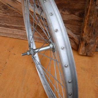 Laufrad mit 20 Zoll Alu Felge "Schürmann" (406-19), Breite 24,5 mm, Einbaumaß 96 mm, Ventilbohrung 8,3 mm, Speichen verzinkt ´, Nabe von Union, Alte Neuware mit leichter Patina