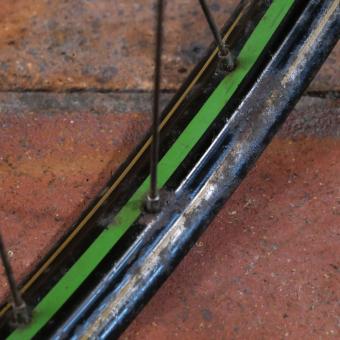 Hinterrad 26 Zoll (559), für Drahtbereifung, Felge 50er Jahre, Felgenbreite ca. 36 mm, grün, Linierung weiß/gold,