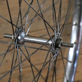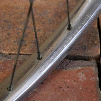 Vorderrad mit Regida-Felge 26 Zoll (559), verchromt, 1970er/80er J., Breite 28 mm, KB-Nabe verchromt, Einbaumaß ca. 91 mm, 2mm Speichen verchromt, gebraucht mit Patina, Zustand gemäß Fotos