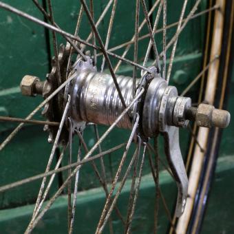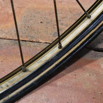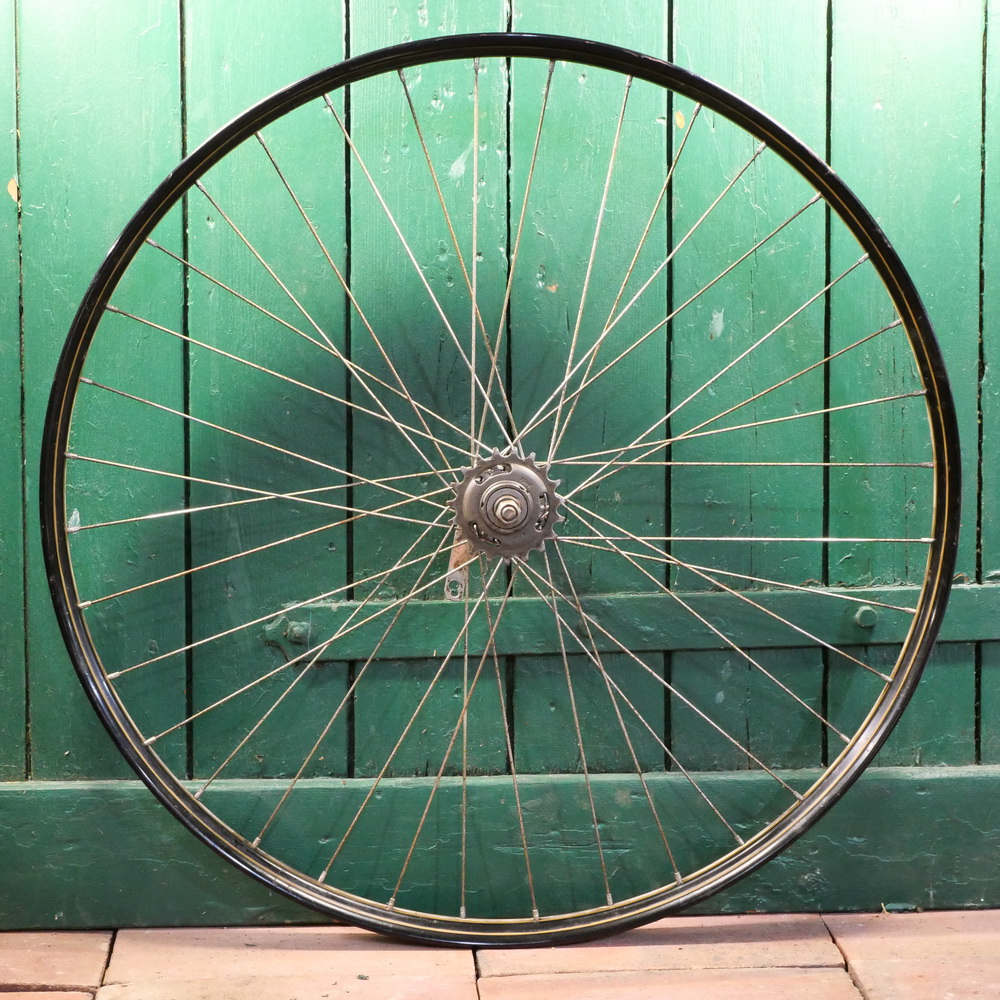 Hinterrad 28 x 1,75 (622), Stahlfelge für Drahtbereifung, für Nostalgierad, Breite ca. 38 mm, schwarz, Linierung gold/weiß, Speichen 2 mm verchromt, Einbaumaß ca. 110 mm, Nabe "F&S Jet" mit Steckritzel 19 Zähne, Patina und Gebrauchsspuren