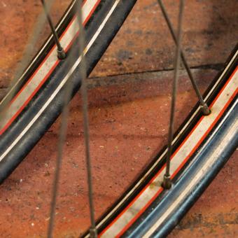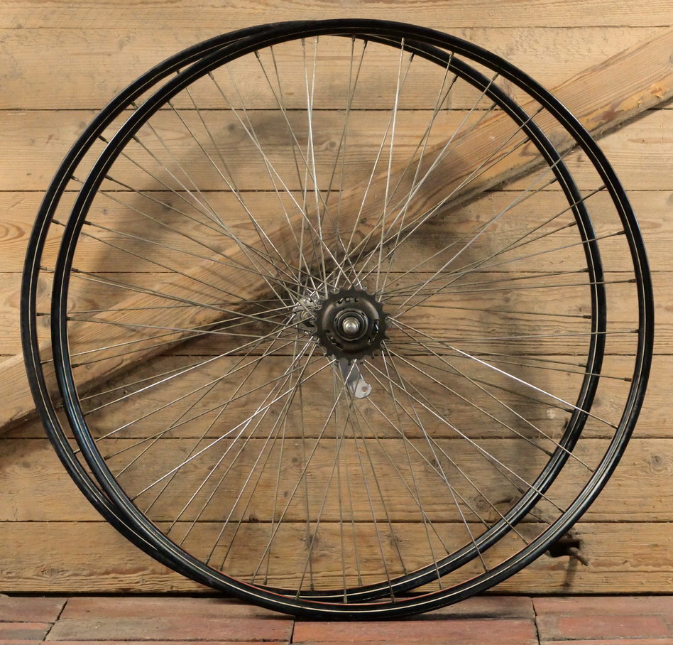 Laufradsatz 28 Zoll (622) für Drahtbereifung, 60er Jahre, Felgenbreite ca. 38 mm, schwarz, Linierung rot/weiß,